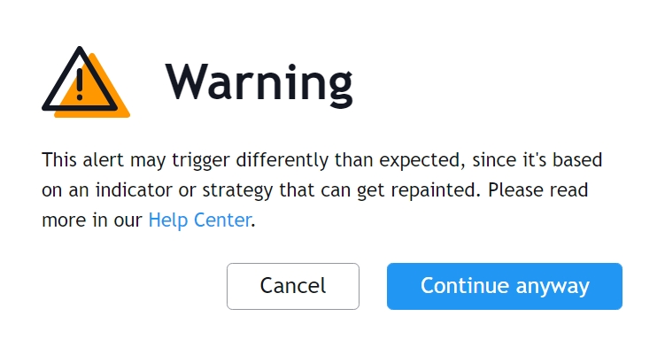 When you create an alert using certain indicators such as the Signals & Overlays indicator, you might see a warning message, this is caused by internal Pinescript functions used in the script that may have a repainting behavior when set in a specific way.